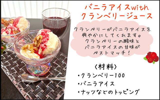 ①バニラアイスにクランベリー100%をかけ、ドライクランベリーをトッピングして完成★