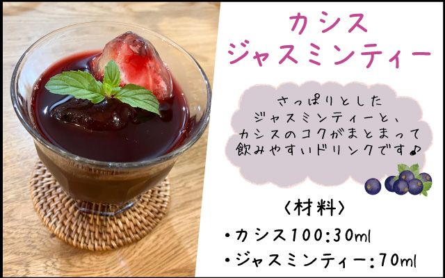 ①グラスに氷、カシス、ジャスミンティーを入れ軽く混ぜて完成。
