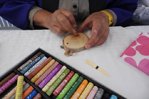 白樺の切り株に穴を開け、オーナメントとして使用します。実際フィンランドのワークショップでわかさHappy隊※の皆さまと一緒にオーナメント作りにチャレンジしました。