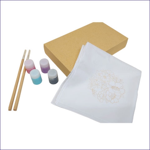 | セット内容 | ●ハンカチ×1枚 ●彩色用顔料×4色(ピンク×1、ムラサキ×1、ブルー×1、グレー×1) ●彩色用筆×2本 ●取扱説明書 |