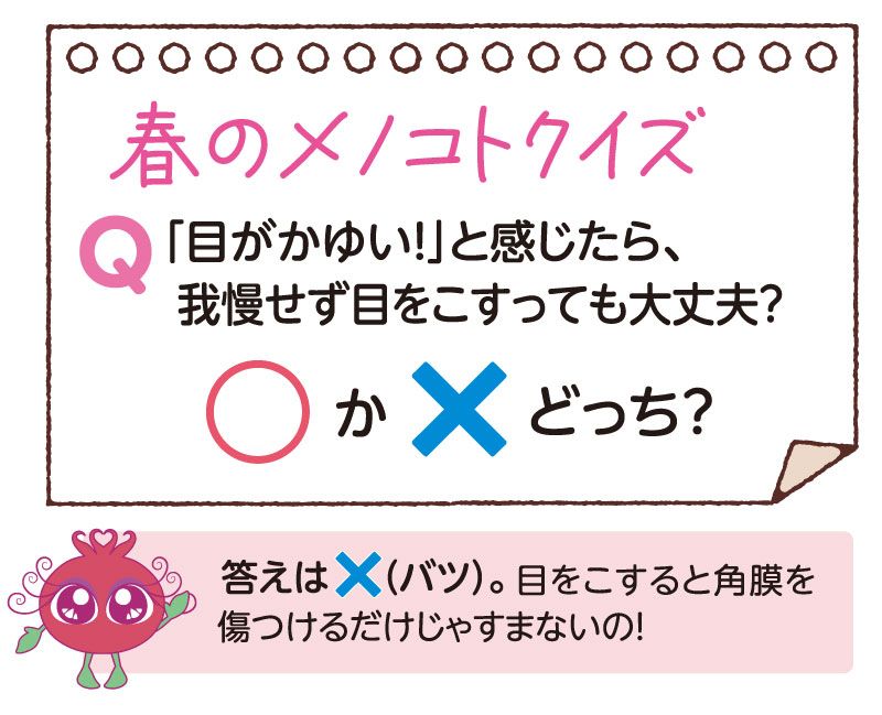待ちに待った春到来!とはいえ、花粉のいたずらで目のかゆみにお悩みの方も多いでしょう。我慢できずに思わずこすってしまうと大変なことに!目にやさしい生活習慣を心がけてくださいね。