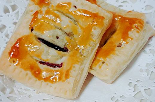 - 【2】切り込みなしのパイシートにカシスジャムをのせ、切り込みありのパイシートをのせて、端をフォークでしっかり押さえ閉じる。