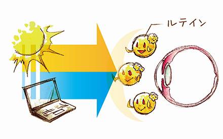 黄斑部や水晶体に存在しているルテインは、有害な光(紫外線やブルーライト)によって発生する活性酸素を除去し、ブルーライトをブロックする働きがあります。