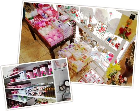 雑貨や化粧品、お菓子など種類も豊富で、お店の中もバラづくしです。