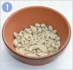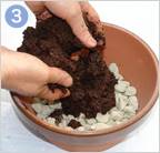 1.大きめの素焼きの平鉢の底に通気性を良くするため軽石を入れます。